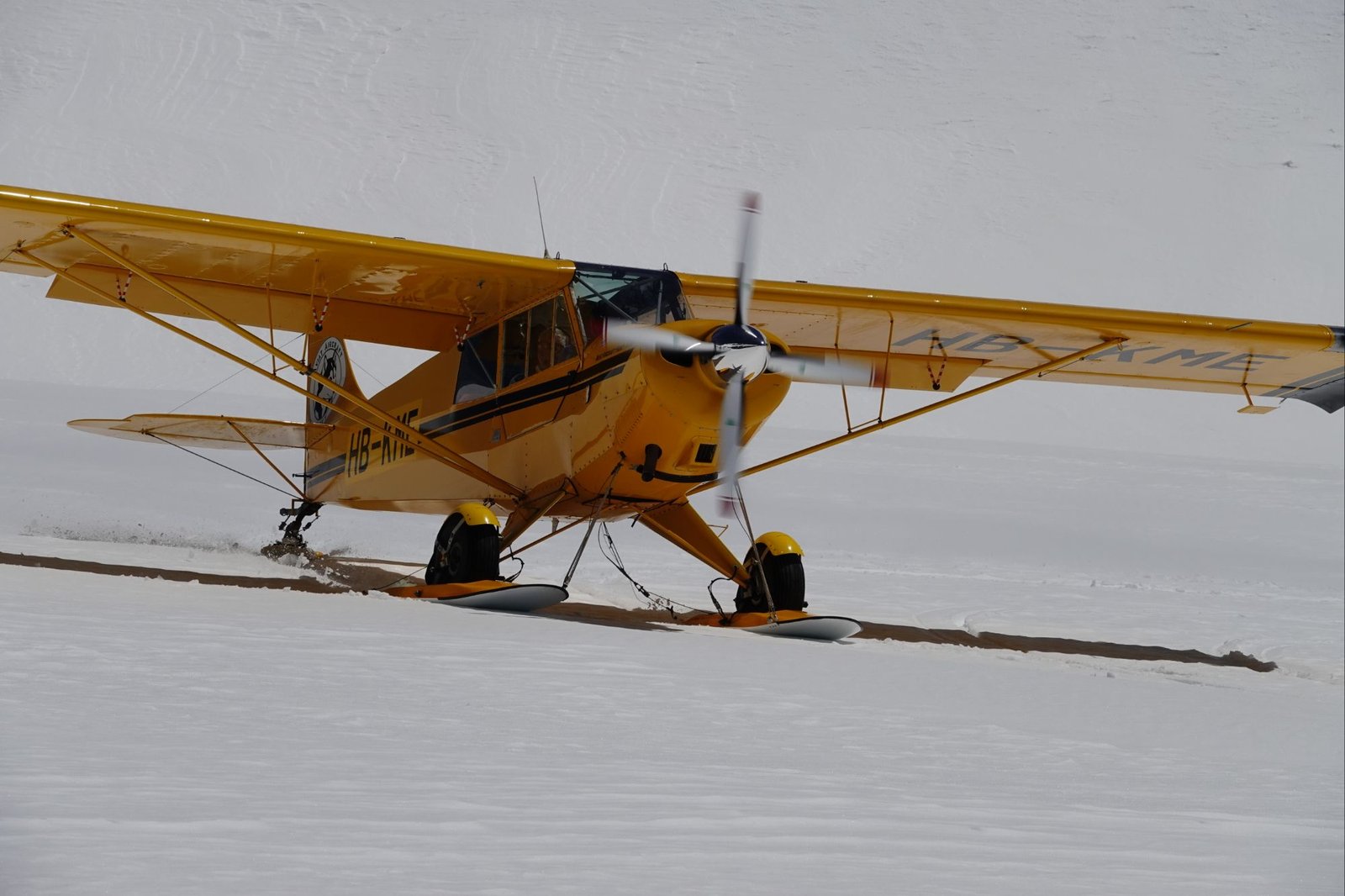 On a relatively flat area near the Monk’s Hut, we passed a cheerful yellow plane, empty, and at rest on the snow. I was intrigued to see it had little skis attached around all 3 wheels, so took a pic :