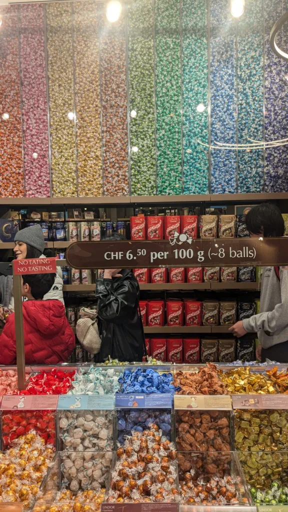 That Lindt chocolate shop was great – they handed you a free Lindor chocolate ball just for walking into it.   I was all for going out and in a few times in disguise, but L thought this might not work. Not sure how much actual business they did at these prices. (Lindor is £3.56 per 100g in Morrisons, I’ve just checked, so the ‘ now you’re a captive audience in a snowstorm” option works out 60% more expensive. And that’s a fact.  )