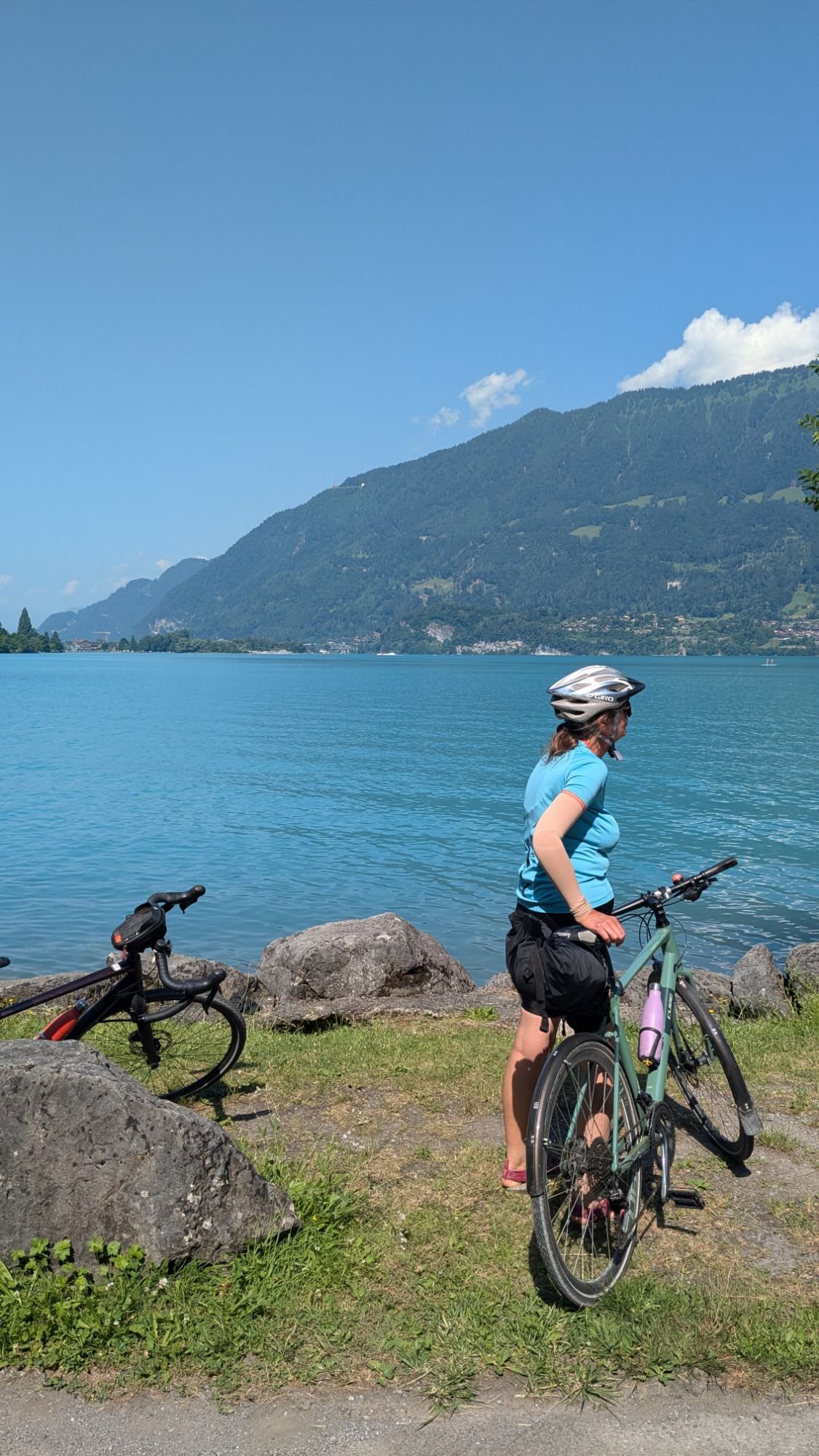 Turning east along Lake Brienz shoreline, we cycled along for a few miles, and it became clear that the Swiss concept of a ” lake shore ride ” is rather different from mine. It teases you with short flat bits before expecting you to head inland and climb up a hundred metres or more in order to carry on. But the lake was a glorious light turquoise , the weather was fair, and we trundled on.