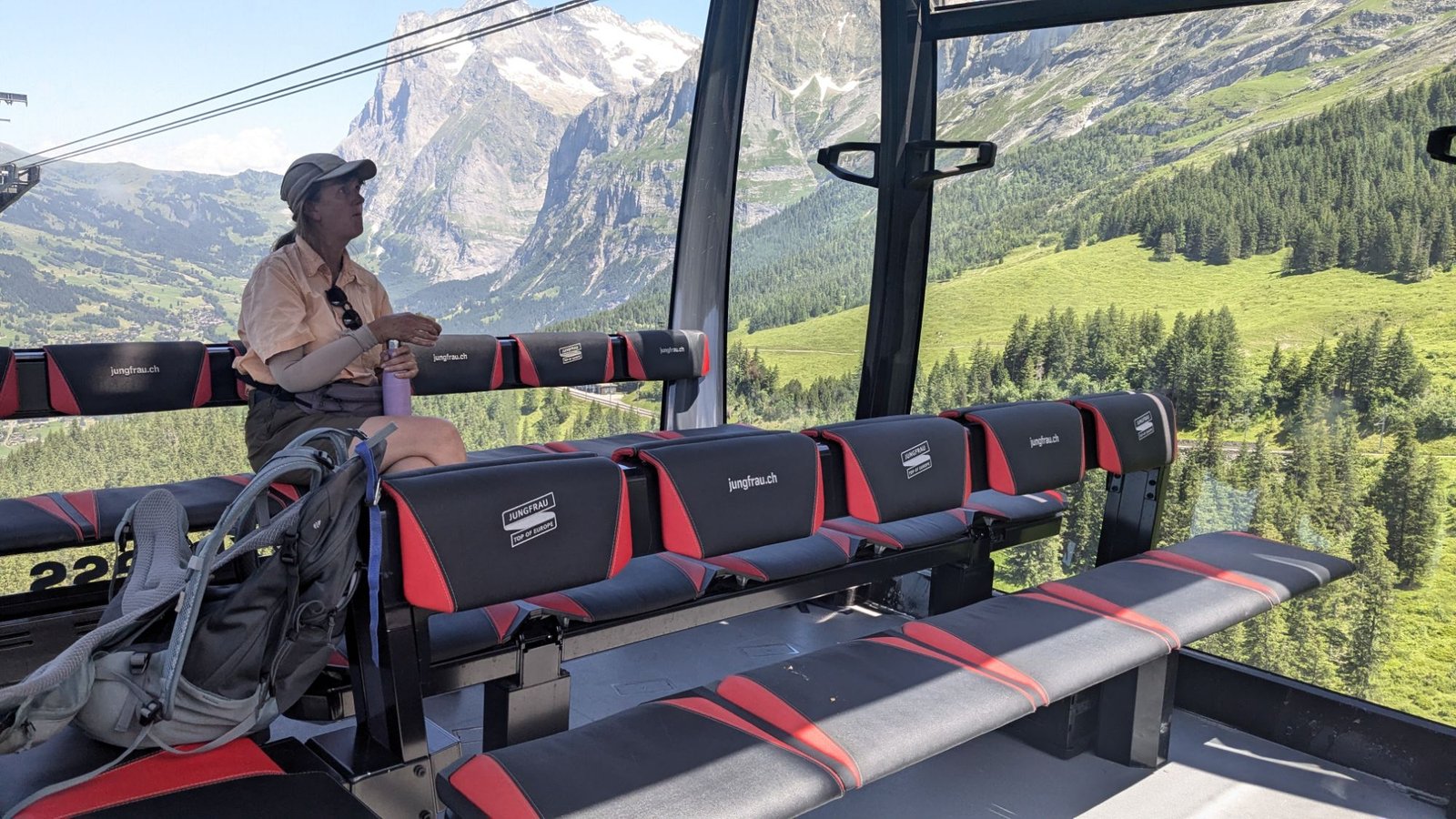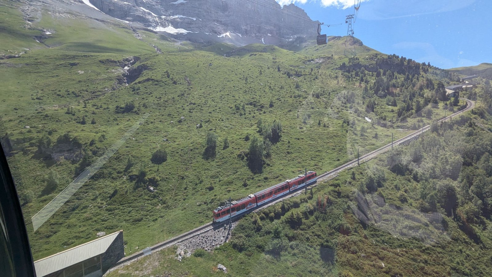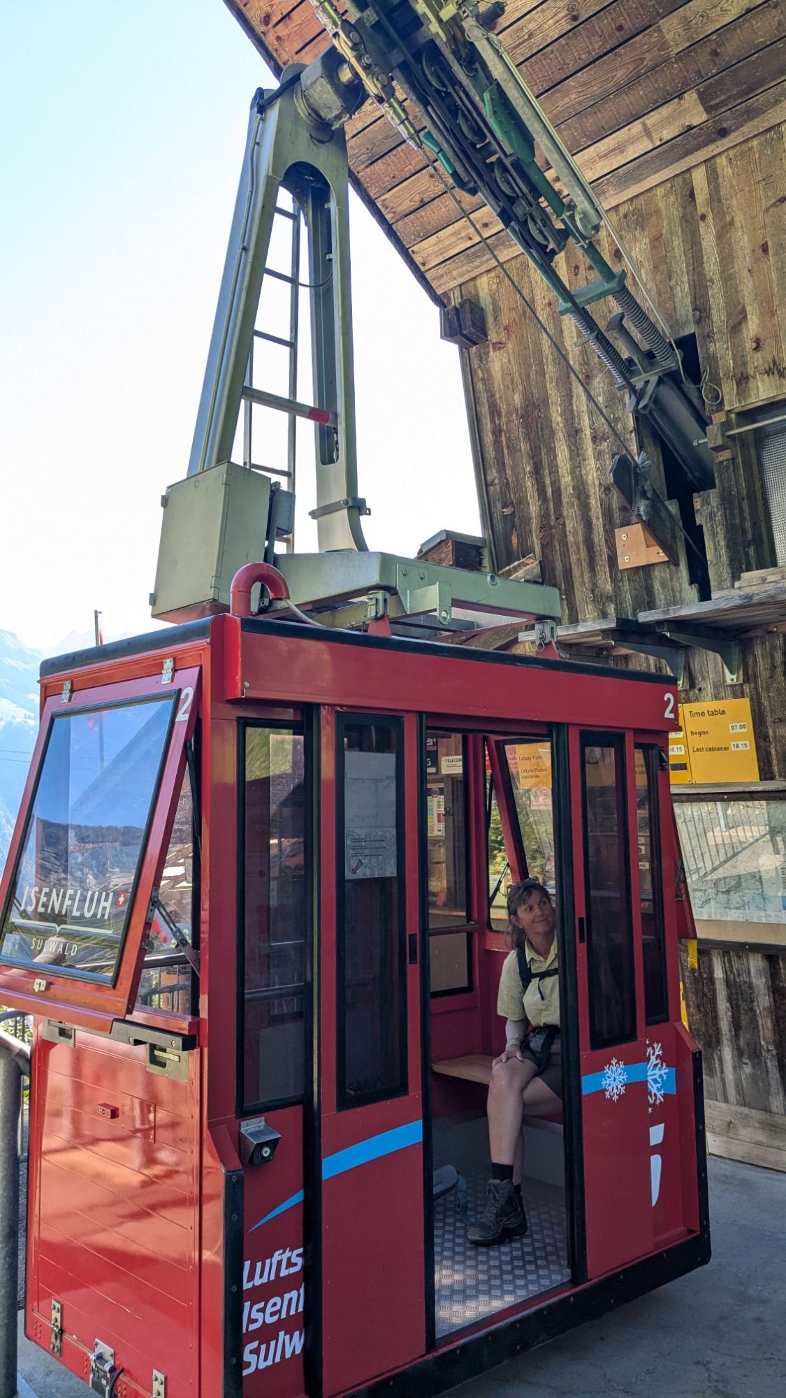 To remind ourselves what a PROPER cable car is – here is the 50 yr old “standing room for 4, wooden benches for 4” version at Isinfluh – very much the Where Eagles Dare model with a lick of red paint.