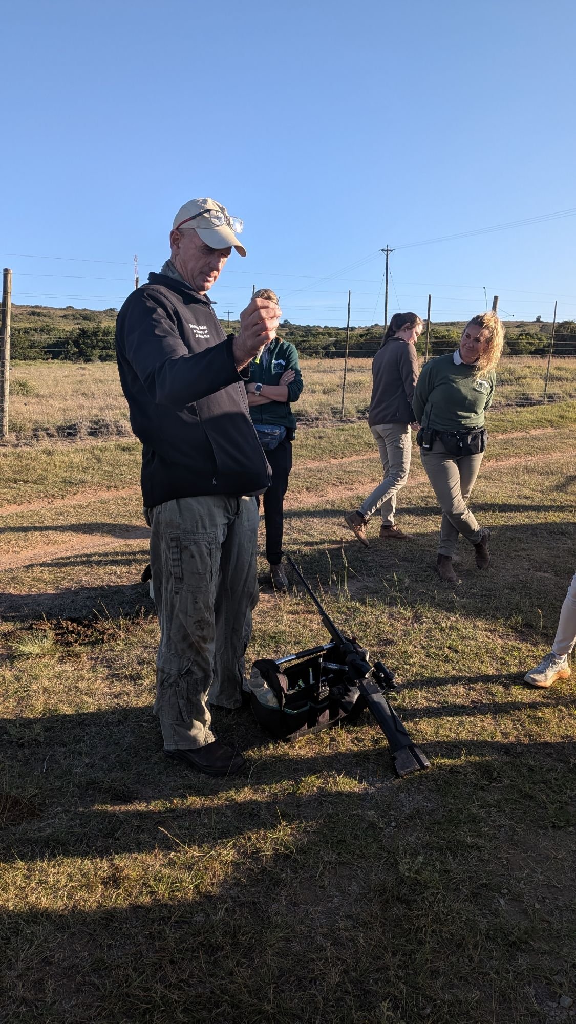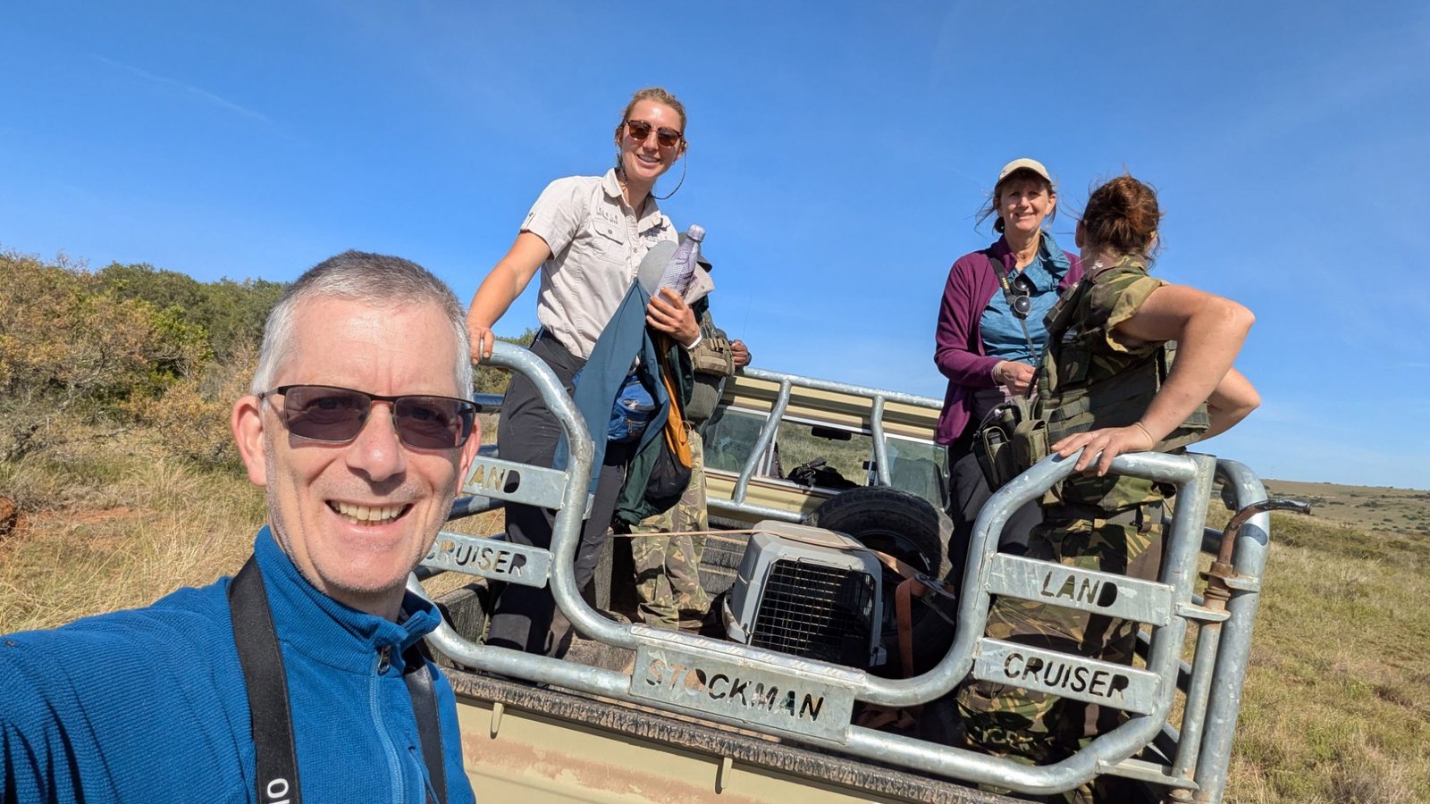 The lead vet himself ( “Dr Will” , owner of the Leeuwenbosch lodge we are guests at) drove us out to meet his team. On the way he discussed methods of restoring biodiversity to the land after it had been intensively farmed for generations (before his family and those around came together to set up Amakhala – apparently the only such ownership of a game reserve in ZA).
