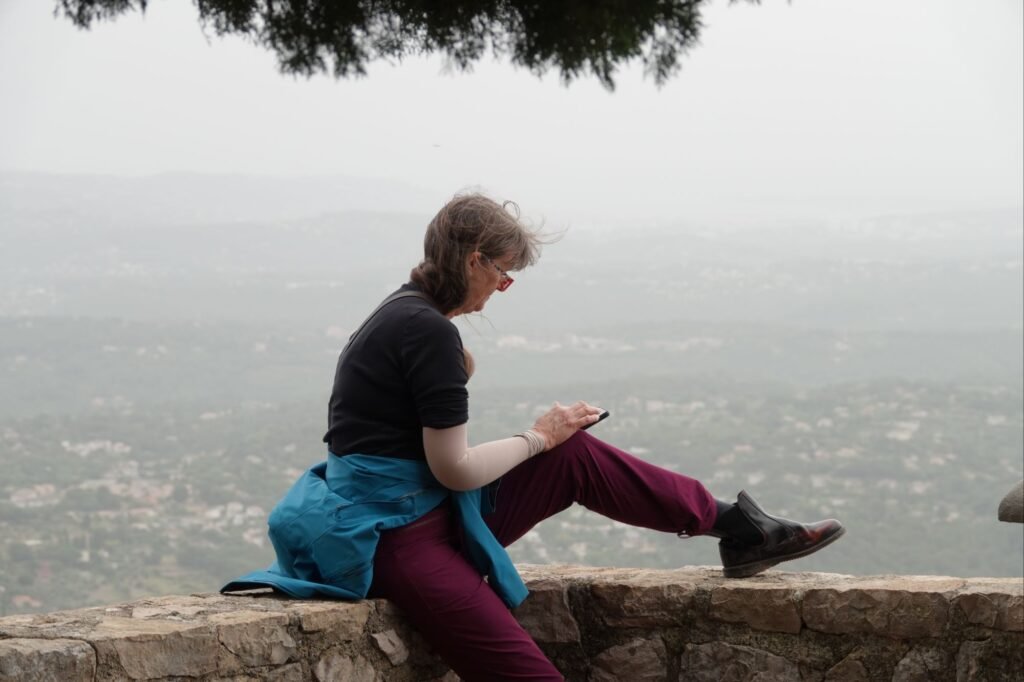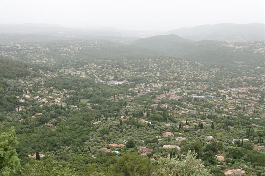 We drove SE for over an hour through the ‘Pre-Alps’ national park and arrived at Cabris, a neat town on steep hillside descending to the Cote d’Azur. This was our view to the coast ( Cannes towards the left , in deep mist) from a famous outlook point