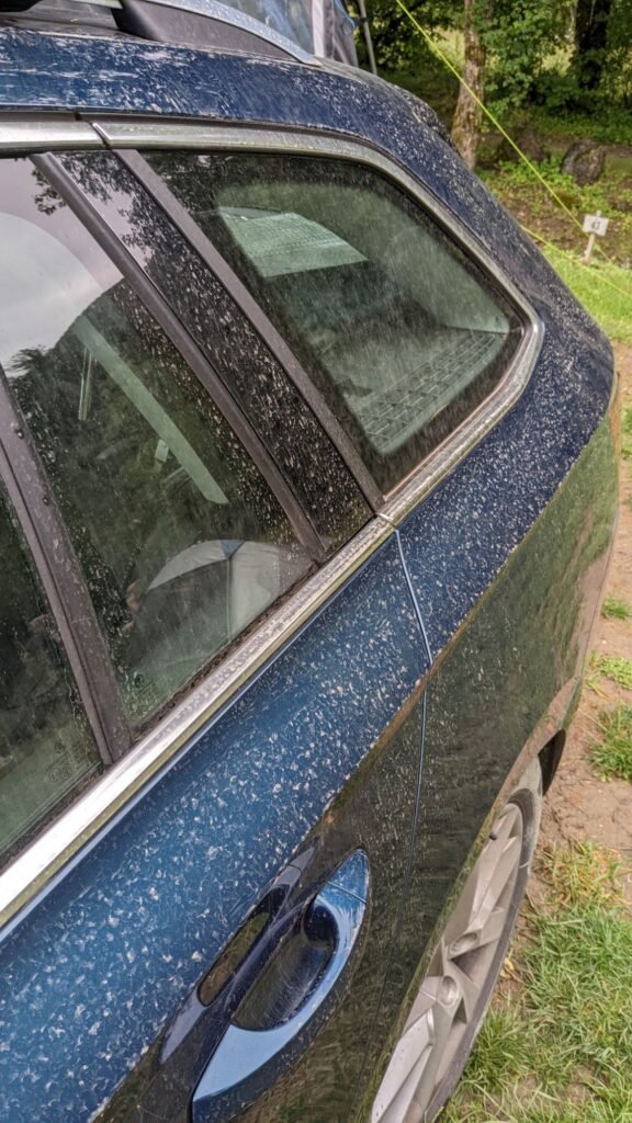 Heavy rain later at the camp site covered everything in brown splodges (result of a sand storm ?) making the car look like we’d been rallying.