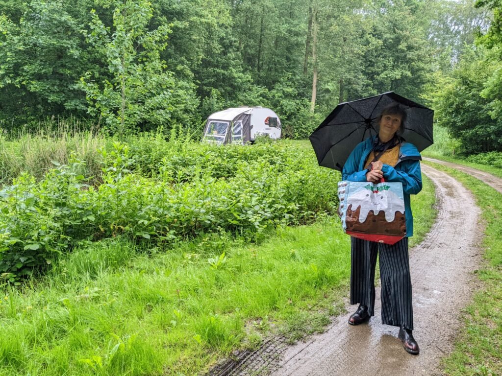 It wasn’t actually raining at this point, so we hurried to get the van and awning set up before the clouds spotted us. Have got a beautiful quiet secluded spot in a “Natuurcamping”. ( This does not mean clothing is optional. But it is very green)