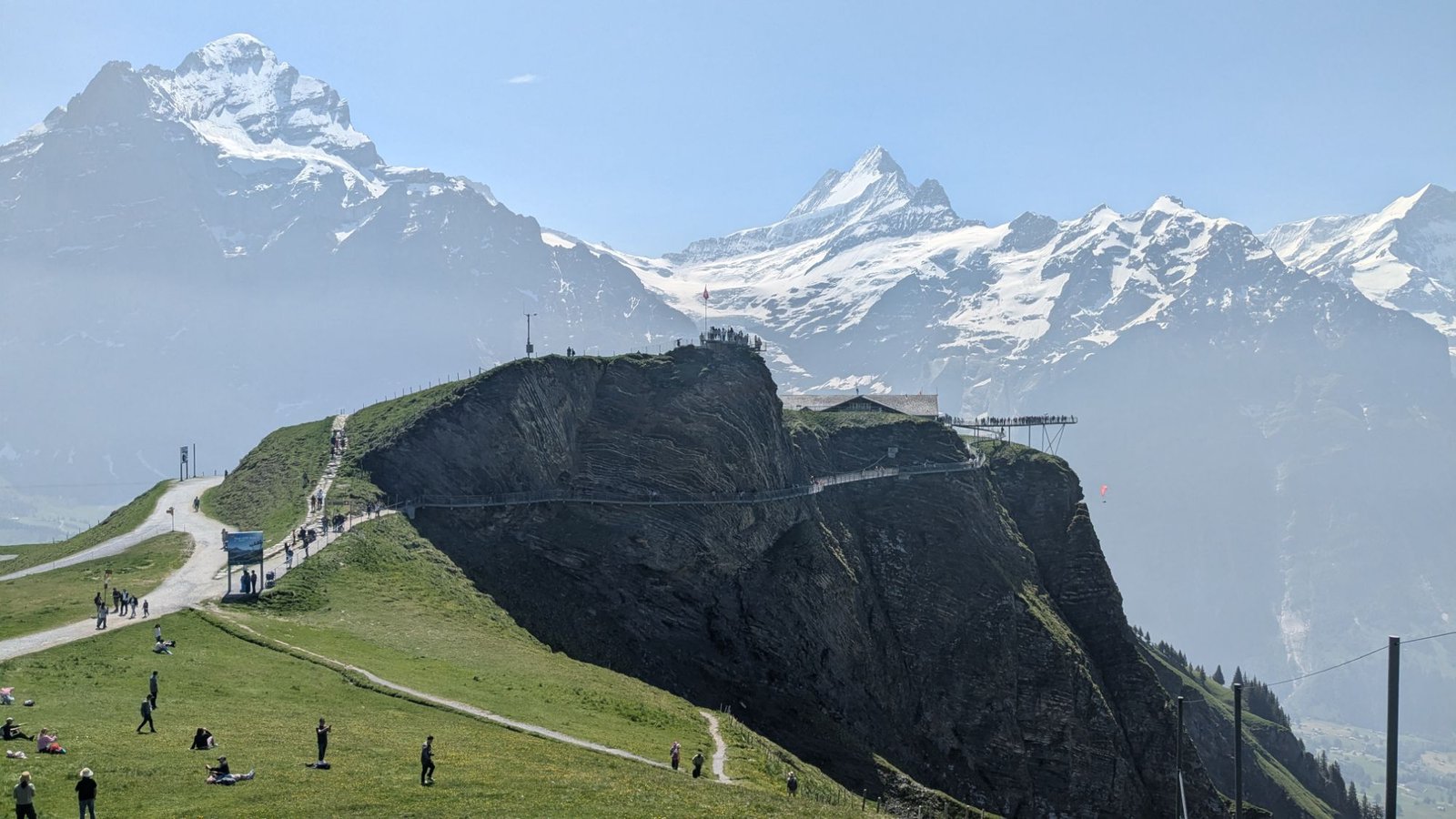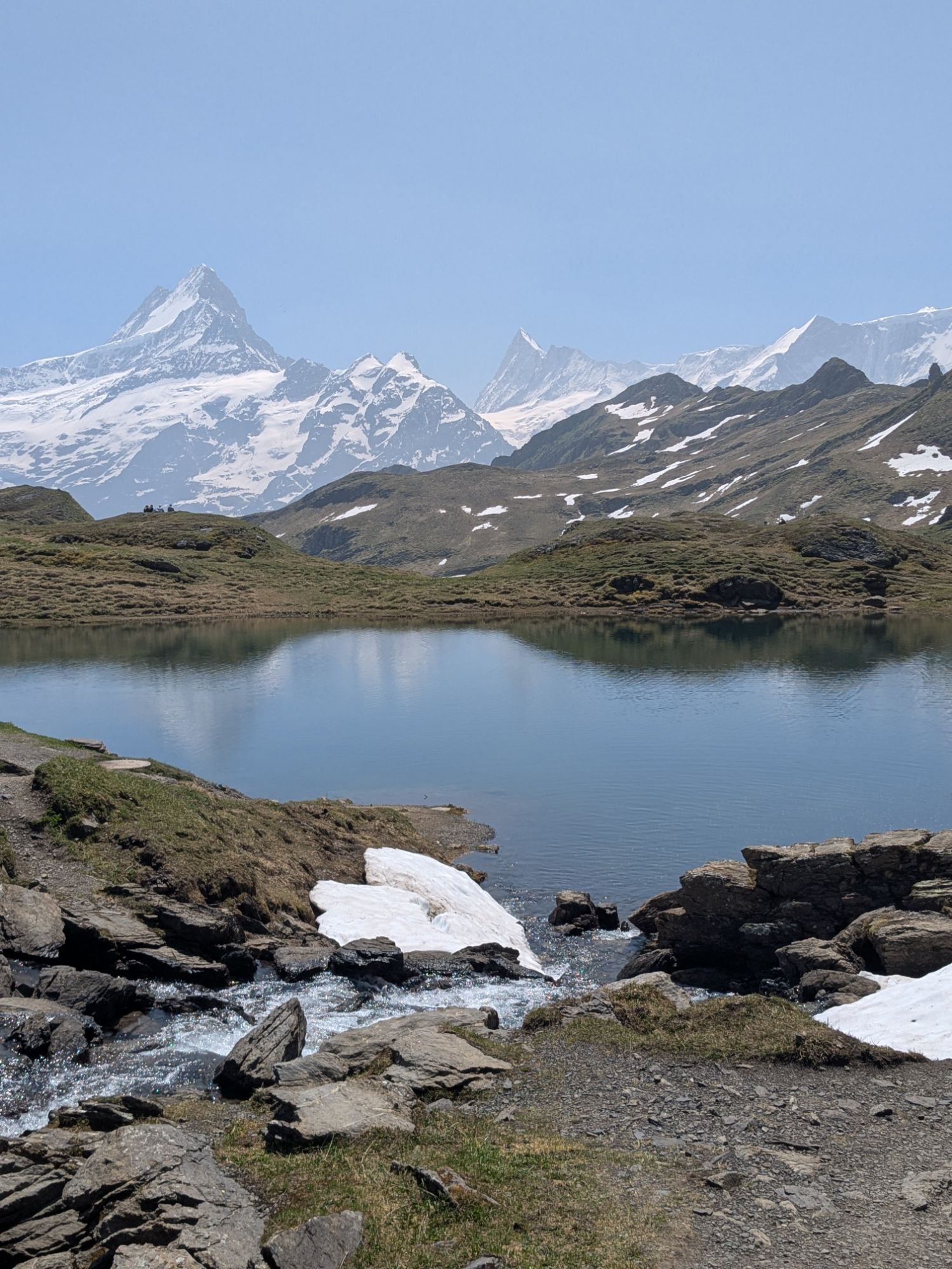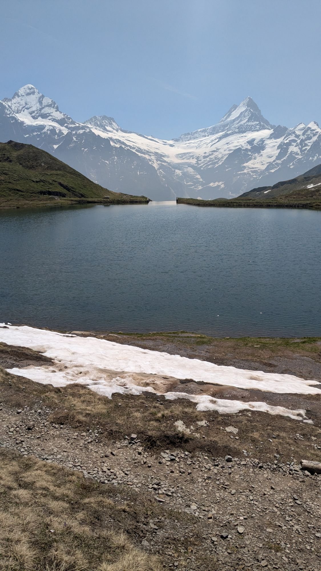 Our first walk followed a wide track rammed with tourists as far as a pair of small lakes – but the way on up to Faulhorn peak was closed by snow cover. At least there were nice views south to our favourite set of Alps : Eiger, Mönch and Jungfrau ( just EMJ from here on, I think )