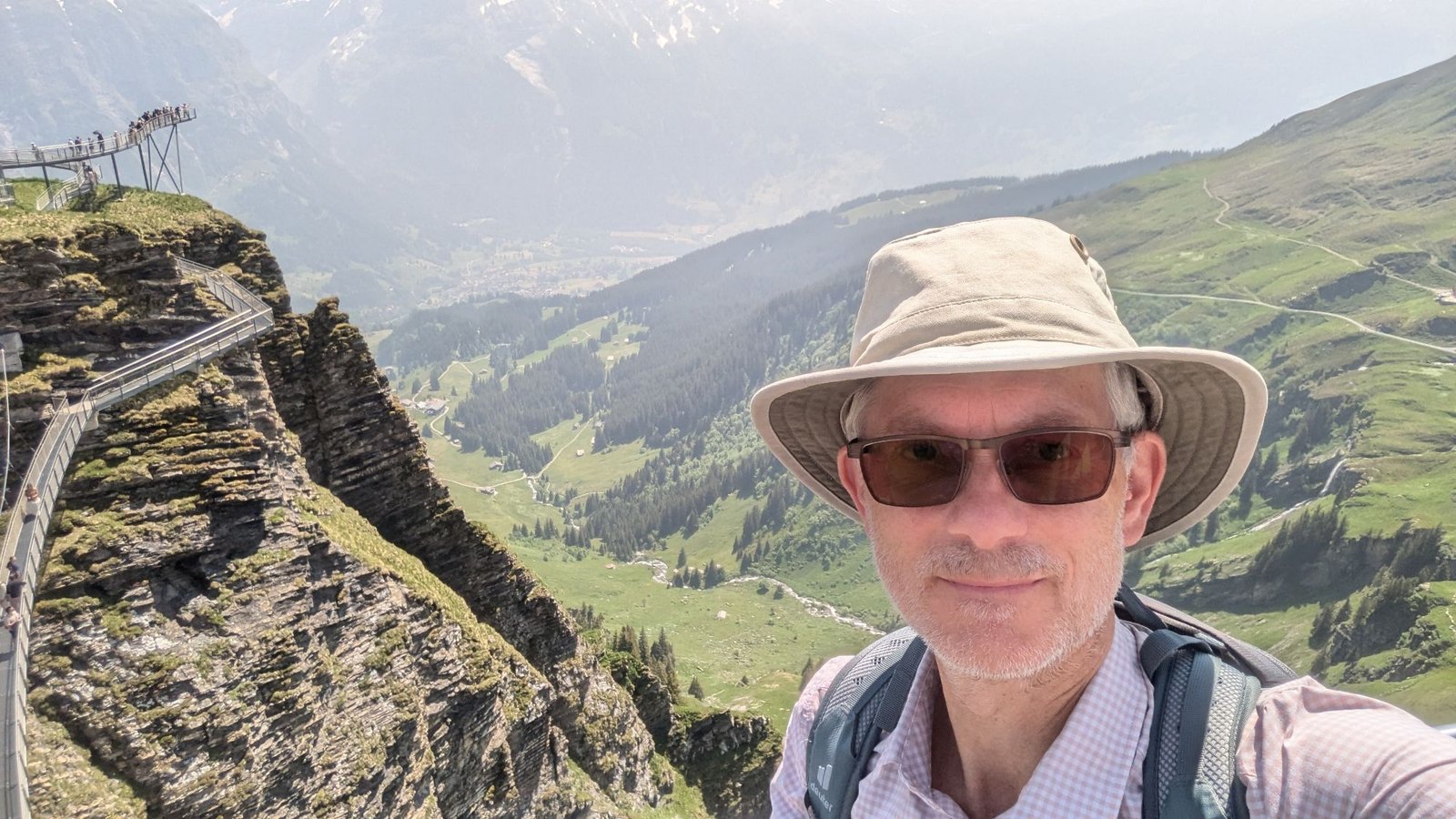 I’d assumed it was just an message of local defiance against US trade tarifs , but turns out that First is in this case a location way up in the mountains north of  Grindelwald, with a modern cable car linking them. So – we took it .