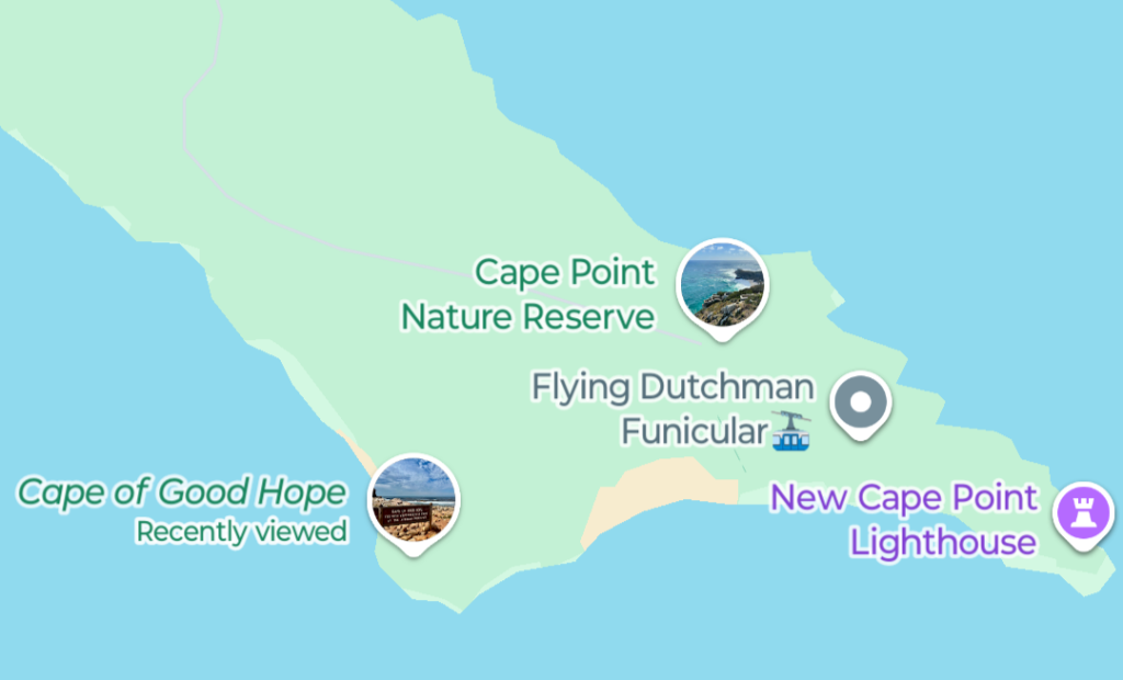 As we climbed back down to the Cape of GH, tourist bus-loads were now queuing for photos by the iconic sign. So we drove around to the larger visitor area at eastern side of the peninsula, by the Cape Point lighthouses.