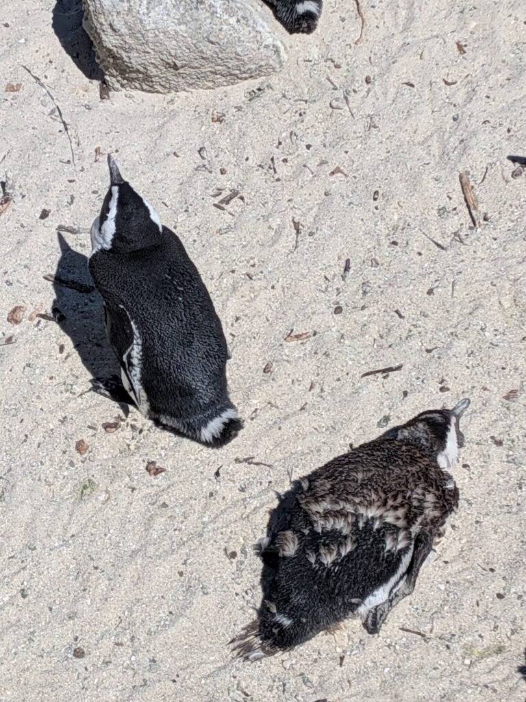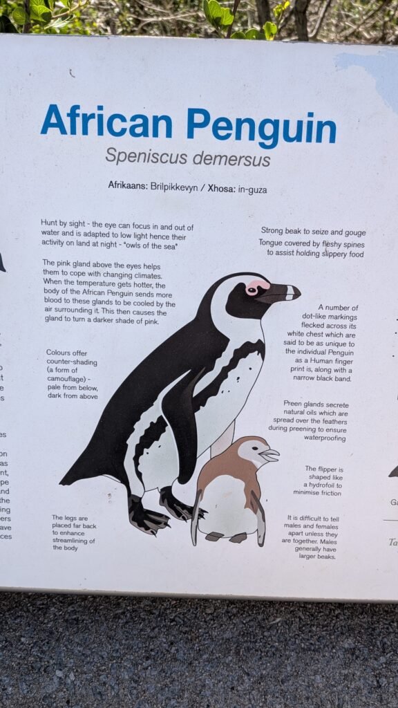 First a better look at the Penguins : found a handy info board , and from closer up on the boardwalk we could see the various stages of moulting as they shed the baby fluff…